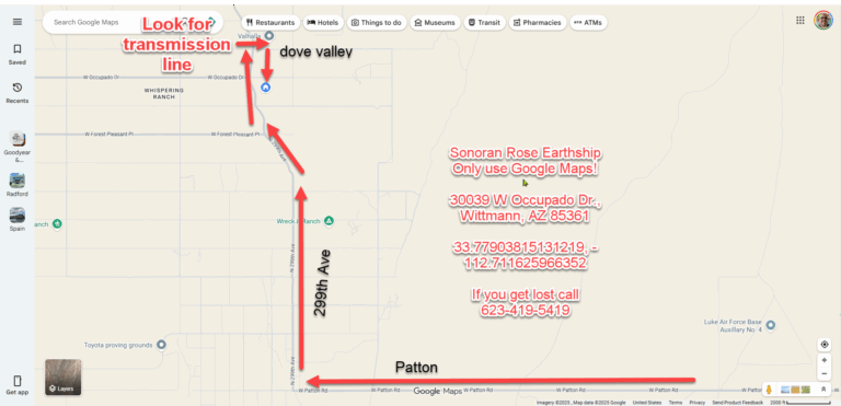 Find the easiest way to reach the Sonoran Rose Earthship using Google Maps. Includes quick directions from Patton Road and our exact GPS coordinates.